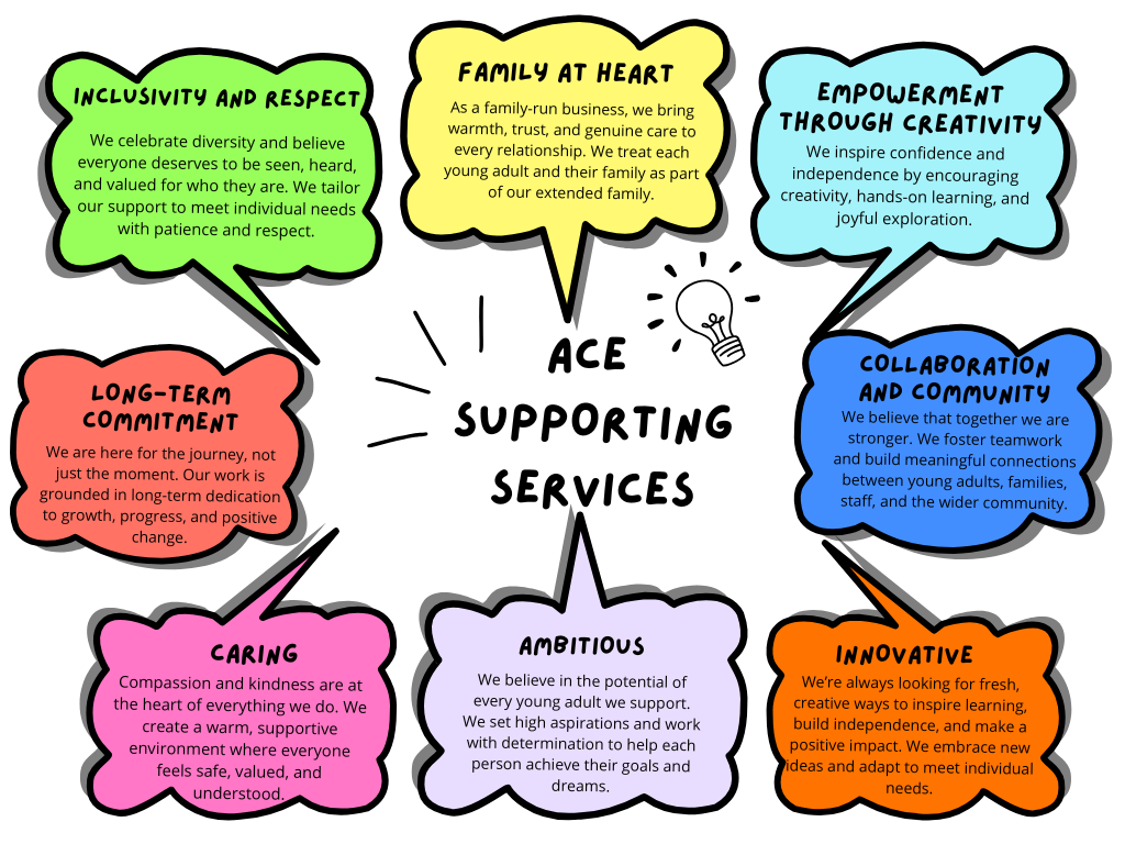 At ACE Supporting Services, our mission is to create a safe, inclusive, and joyful environment where young adults with learning disabilities can discover their strengths, grow their independence, and build meaningful connections. We are dedicated to helping each person thrive through creativity, learning, and fun, always with compassion at the core.